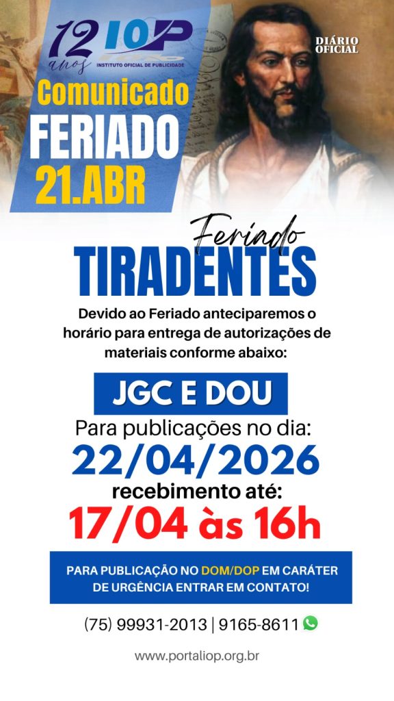 O INSTITUTO OFICIAL DE PUBLICIDADE LEGAL – IOP é uma instituição sem fins lucrativos, apartidário, não confessional, com duração indeterminada, tendo sede e foro na cidade de Feira de Santana, Bahia, com atuação em todo território brasileiro.